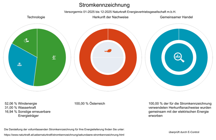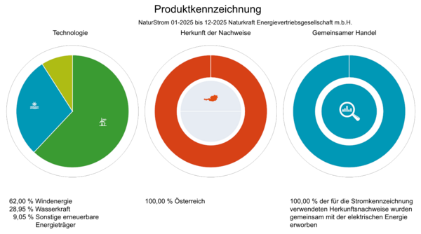 Gemäß § 86 und § 87 Elektrizitätswirtschaftsgesetz idF BGBl. I Nr. 91/2025 und Stromkennzeichnungsverordnung 2022 idF BGBl. II Nr. 223/2025 gibt Naturkraft Energievertriebsgesellschaft m.b.H. die primäre Stromkennzeichnung für den Zeitraum 1.1.2025 bis 31.12.2025 bekannt, auf Basis derer die gesamte im Zeitraum 1.1.2025 bis 31.12.2025 von Naturkraft Energievertriebsgesellschaft m.b.H. an Endkundinnen und Endkunden verkaufte elektrische Energie erzeugt wurde: