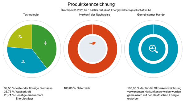 Gemäß § 86 und § 87 Elektrizitätswirtschaftsgesetz idF BGBl. I Nr. 91/2025 und Stromkennzeichnungsverordnung 2022 idF BGBl. II Nr. 223/2025 gibt Naturkraft Energievertriebsgesellschaft m.b.H. die primäre Stromkennzeichnung für den Zeitraum 1.1.2025 bis 31.12.2025 bekannt, auf Basis derer die gesamte im Zeitraum 1.1.2025 bis 31.12.2025 von Naturkraft Energievertriebsgesellschaft m.b.H. an Endkundinnen und Endkunden verkaufte elektrische Energie erzeugt wurde: