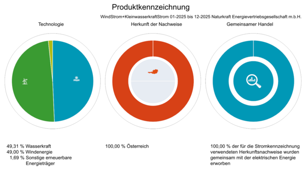 Gemäß § 86 und § 87 Elektrizitätswirtschaftsgesetz idF BGBl. I Nr. 91/2025 und Stromkennzeichnungsverordnung 2022 idF BGBl. II Nr. 223/2025 gibt Naturkraft Energievertriebsgesellschaft m.b.H. die primäre Stromkennzeichnung für den Zeitraum 1.1.2025 bis 31.12.2025 bekannt, auf Basis derer die gesamte im Zeitraum 1.1.2025 bis 31.12.2025 von Naturkraft Energievertriebsgesellschaft m.b.H. an Endkundinnen und Endkunden verkaufte elektrische Energie erzeugt wurde: